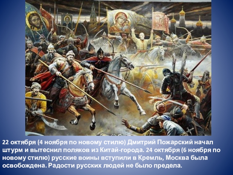 и вытеснил поляков из Китай-города. 24 октября (6 ноября по новому стилю) русские воины вступили в Кремль, Москва была освобождена. Радости русских людей не было предела.