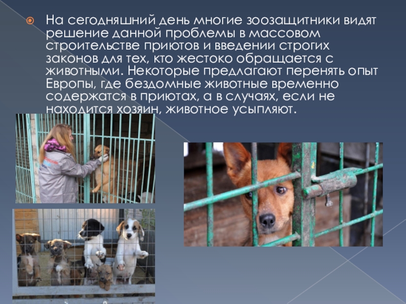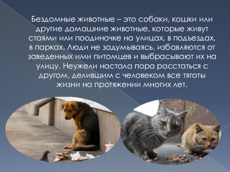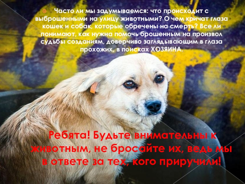 Проблема бездомных животных давно уже всех тревожит, ведь животные, как дети: собаки и кошки не виноваты, что они оказываются на улице или в приюте, так же, как дети, которые оказываются в «Доме ребёнка» или в приюте для сирот. Каждый из них, появившийся на свет, имеет право на достойную жизнь. Это, в первую очередь, зависит от хозяев и родителей, от их человеческих качеств. А эти качества необходимо развивать у человека, начиная с раннего возраста.