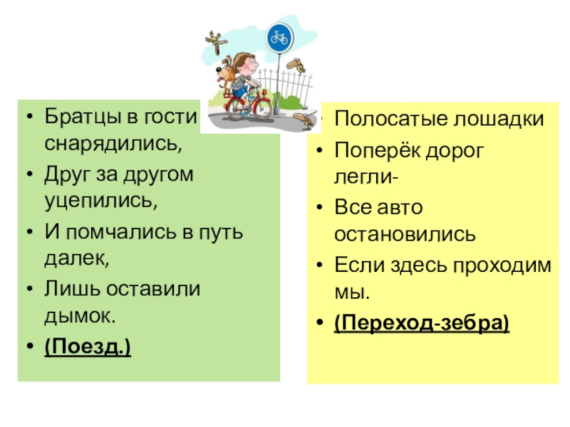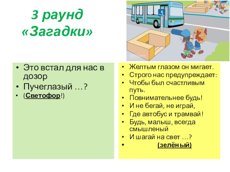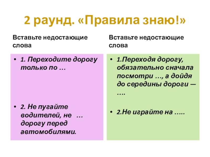 1.Переходя дорогу, обязательно сначала посмотри …, а дойдя до середины дороги — ….