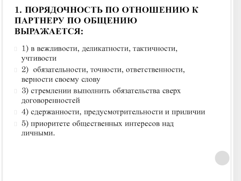 Слайд 161. ПОРЯДОЧНОСТЬ ПО ОТНОШЕНИЮ К ПАРТНЕРУ ПО ОБЩЕНИЮ ВЫРАЖАЕТСЯ: