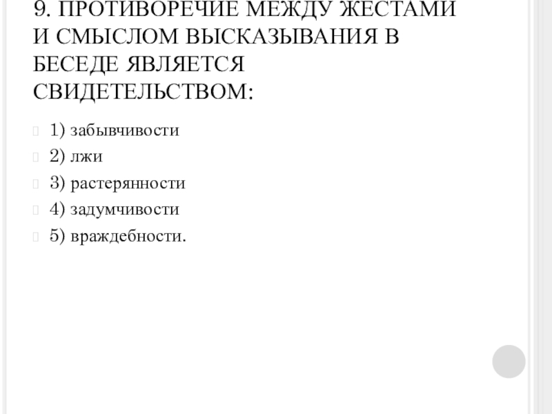 Слайд 249. ПРОТИВОРЕЧИЕ МЕЖДУ ЖЕСТАМИ И СМЫСЛОМ ВЫСКАЗЫВАНИЯ В БЕСЕДЕ ЯВЛЯЕТСЯ СВИДЕТЕЛЬСТВОМ:
