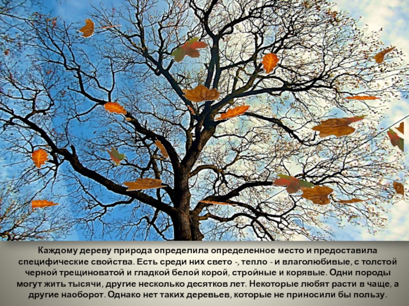 Слайд 4Каждому дереву природа определила определенное место и предоставила специфические свойства. Есть