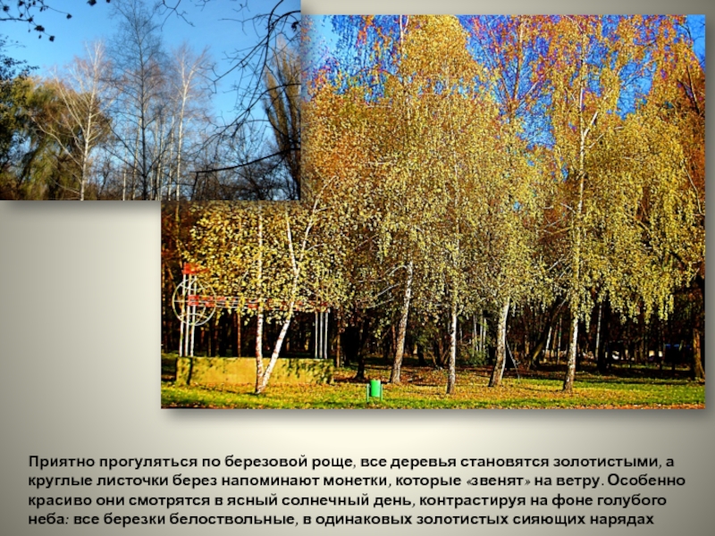 Слайд 3Приятно прогуляться по березовой роще, все деревья становятся золотистыми, а круглые