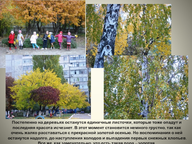 Слайд 9Постепенно на деревьях останутся единичные листочки, которые тоже опадут и последняя
