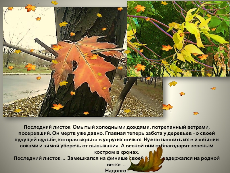 Слайд 2Последний листок. Омытый холодными дождями, потрепанный ветрами, посеревший. Он мертв уже