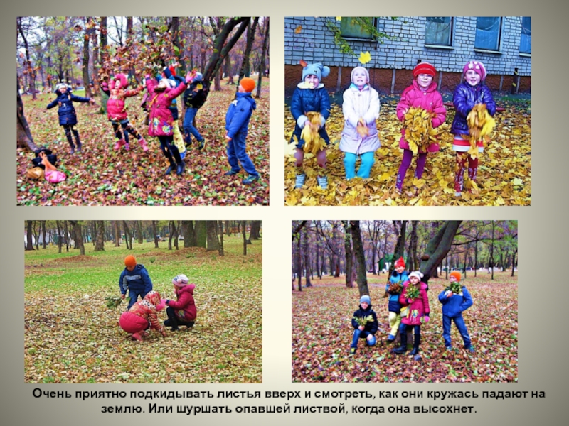 Слайд 8Очень приятно подкидывать листья вверх и смотреть, как они кружась падают