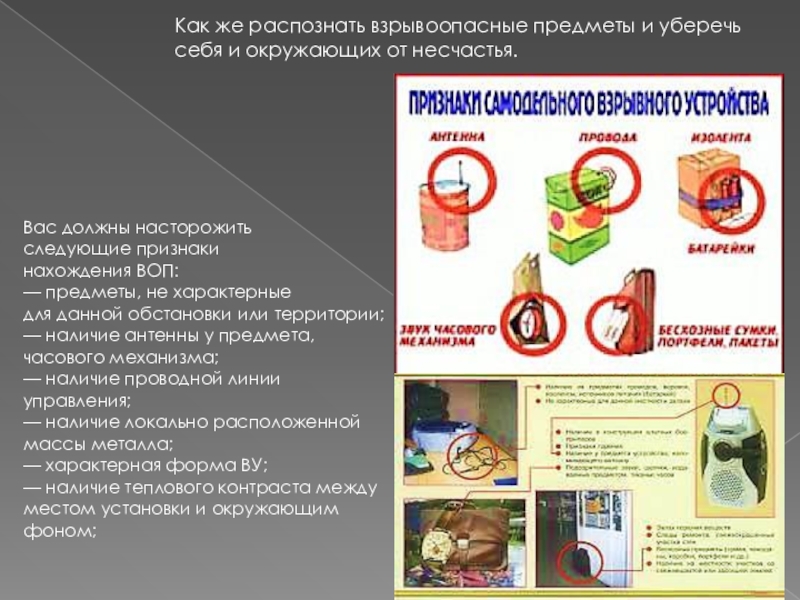 Как же распознать взрывоопасные предметы и уберечь себя и окружающих от несчастья.Вас должны насторожить следующие признаки нахождения ВОП:— предметы, не характерные для данной обстановки
