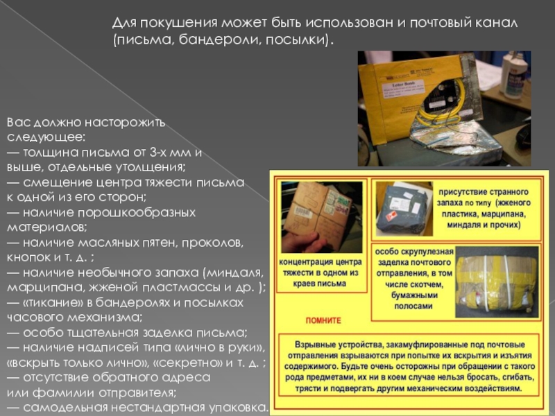 Слайд 7Для покушения может быть использован и почтовый канал (письма, бандероли, посылки).