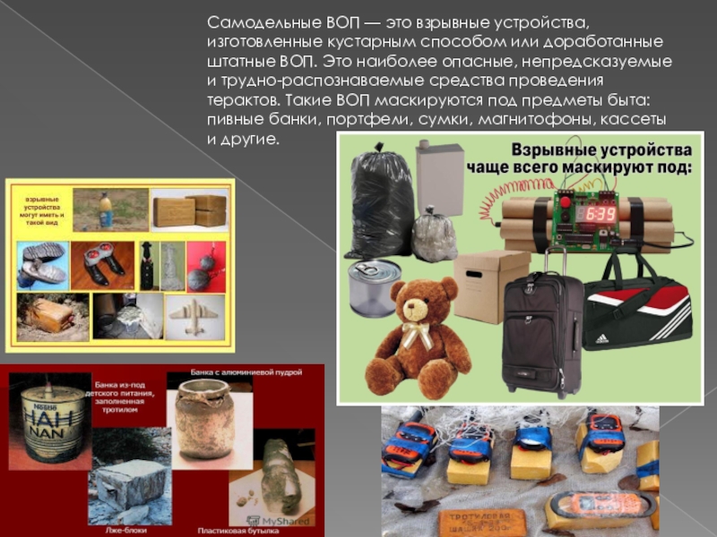 Слайд 4Самодельные ВОП — это взрывные устройства, изготовленные кустарным способом или доработанные штатные ВОП.