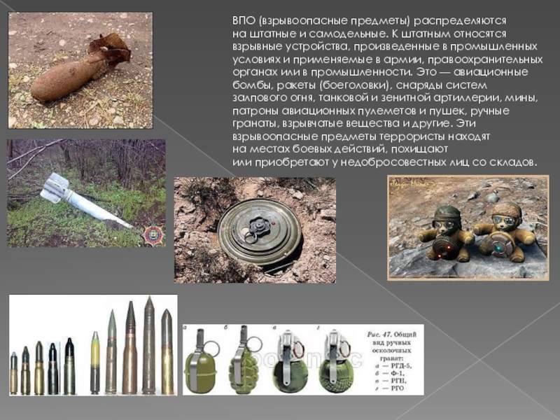 Слайд 3ВПО (взрывоопасные предметы) распределяются на штатные и самодельные. К штатным относятся взрывные устройства, произведенные