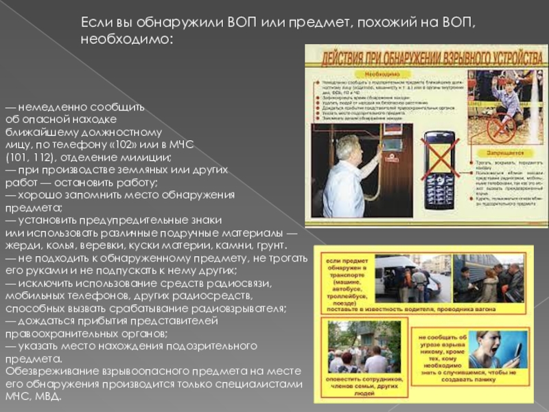 Если вы обнаружили ВОП или предмет, похожий на ВОП, необходимо:— немедленно сообщить об опасной находке ближайшему должностному лицу, по телефону «102»