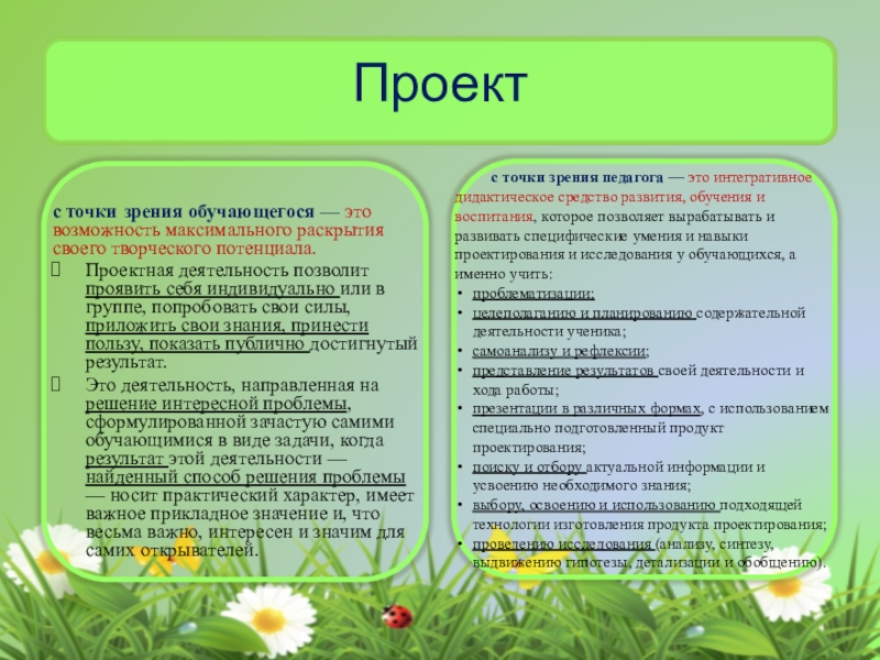 с точки зрения педагога — это интегративное дидактическое средство развития, обучения и воспитания, которое позволяет вырабатывать и развивать специфические умения и навыки проектирования и исследования у обучающихся, а именно учить: