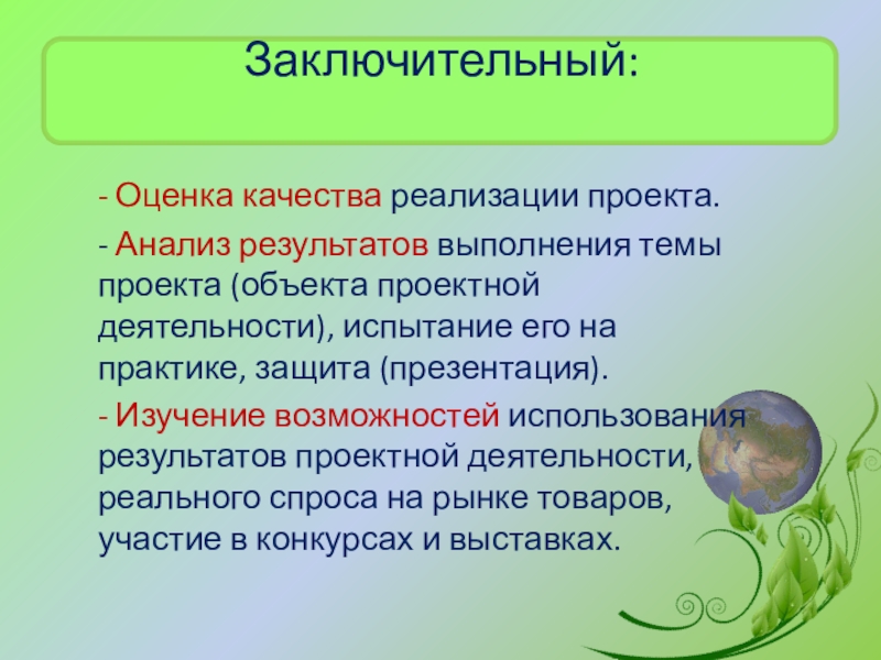 проектной деятельности), испытание его на практике, защита (презентация).