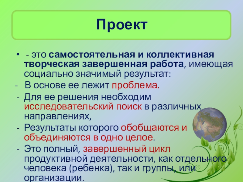 проблему в результате самостоятельных действий обучающихся, с обязательной презентацией этих результатов.
