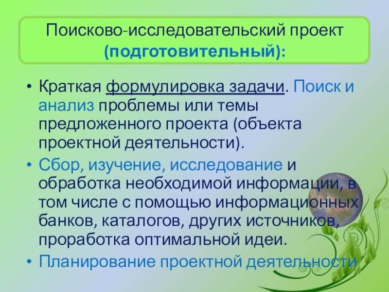 Слайд 17Поисково-исследовательский проект (подготовительный):
