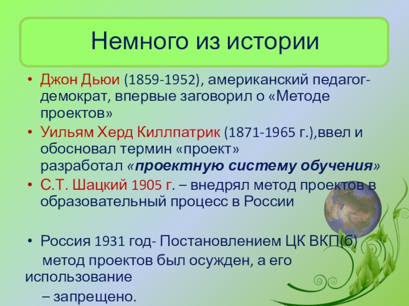 Уильям Херд Киллпатрик (1871-1965 г.),ввел и обосновал термин «проект» разработал «проектную систему обучения»