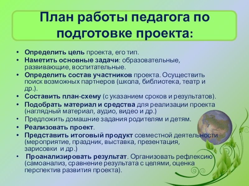Слайд 20План работы педагога по подготовке проекта:
