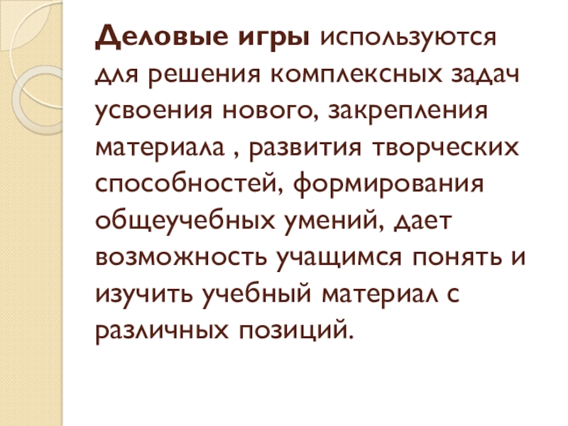 Деловые игры используются для решения комплексных задач усвоения нового, закрепления материала ,