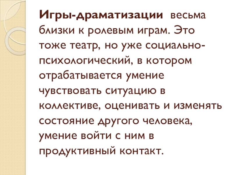 Игры-драматизации весьма близки к ролевым играм. Это тоже театр, но уже социально-психологический,