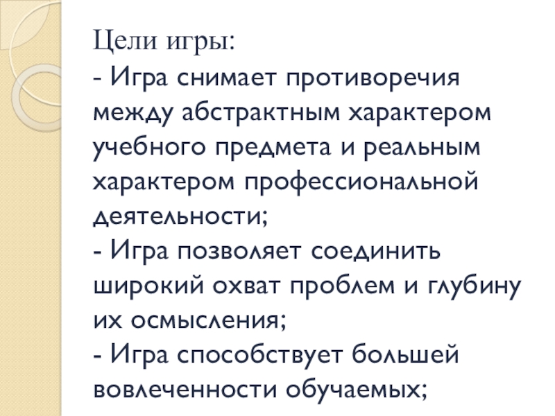 - Игра снимает противоречия между абстрактным характером учебного предмета и