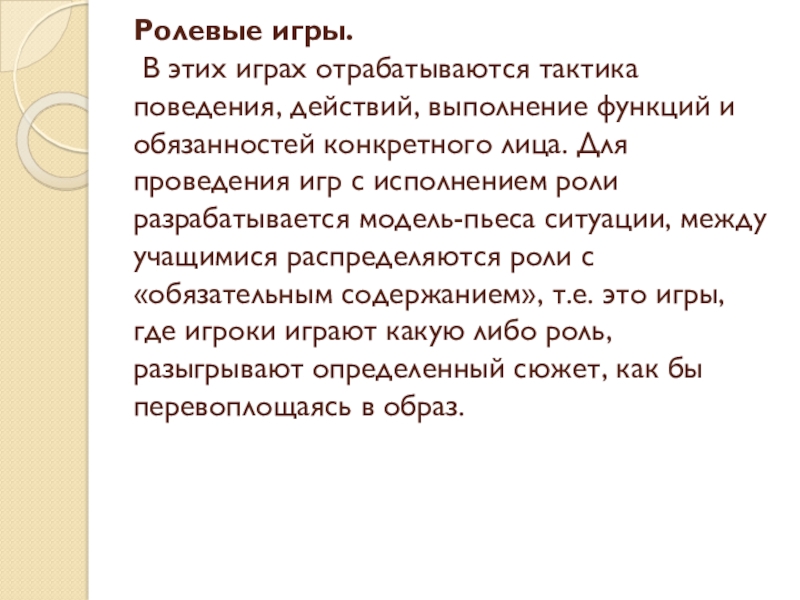 обязанностей конкретного лица. Для проведения игр с исполнением роли разрабатывается модель-пьеса ситуации, между учащимися распределяются роли с «обязательным содержанием», т.е. это игры, где игроки играют какую либо роль, разыгрывают определенный сюжет, как бы перевоплощаясь в образ.