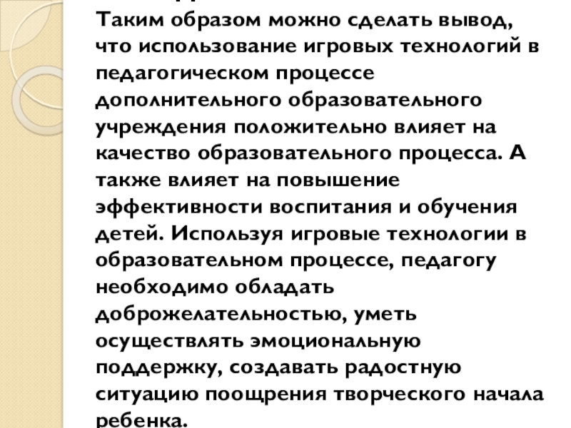 Таким образом можно сделать вывод, что использование игровых технологий в педагогическом