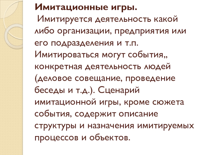 т.п. Имитироваться могут события,, конкретная деятельность людей (деловое совещание, проведение беседы и т.д.). Сценарий имитационной игры, кроме сюжета события, содержит описание структуры и назначения имитируемых процессов и объектов.