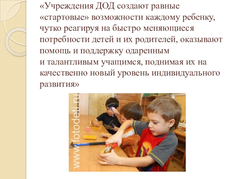 Главная отличительная черта учреждений ДОД состоит в том, что перед педагогами