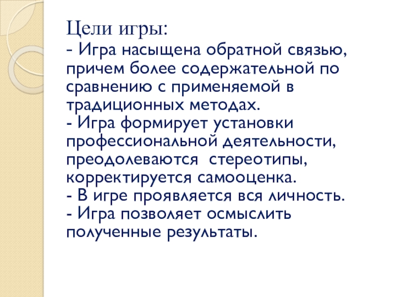 - Игра формирует установки профессиональной деятельности, преодолеваются стереотипы, корректируется самооценка.