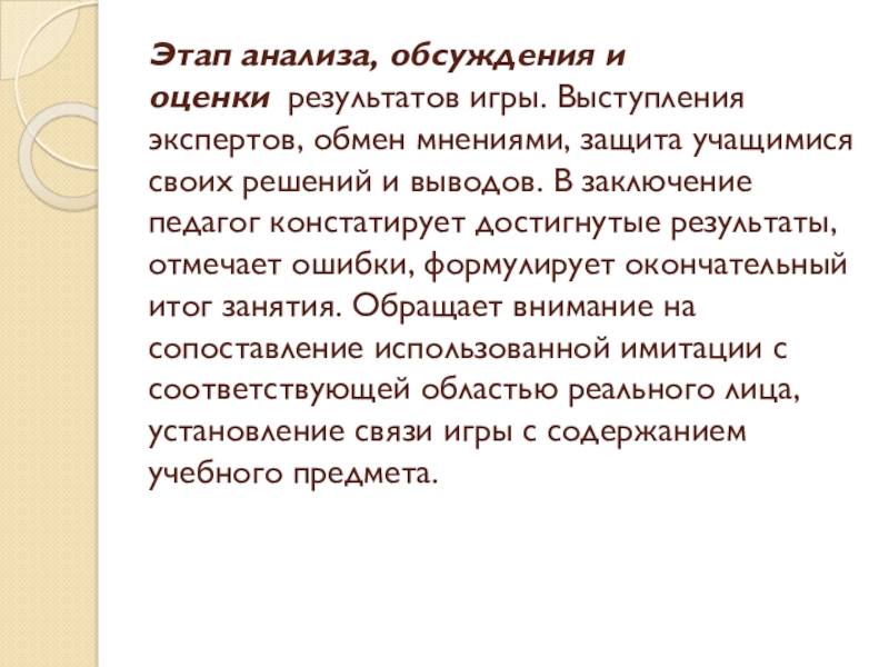 учащимися своих решений и выводов. В заключение педагог констатирует достигнутые результаты, отмечает ошибки, формулирует окончательный итог занятия. Обращает внимание на сопоставление использованной имитации с соответствующей областью реального лица, установление связи игры с содержанием учебного предмета.