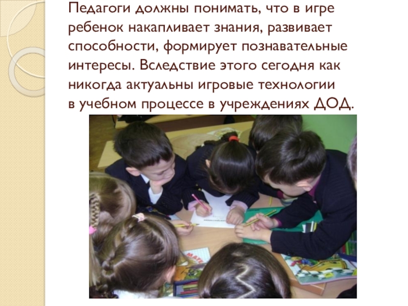 формирует познавательные интересы. Вследствие этого сегодня как никогда актуальны игровые технологии в учебном процессе в учреждениях ДОД.