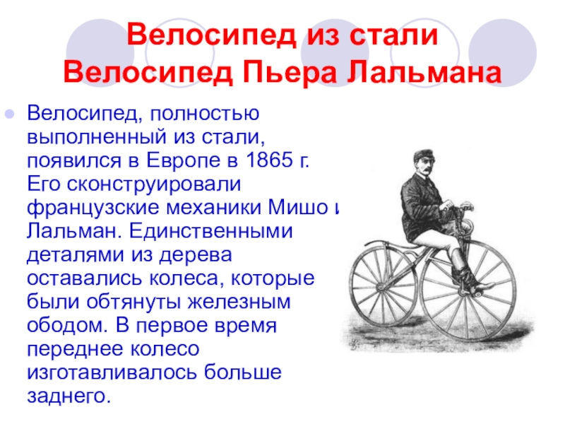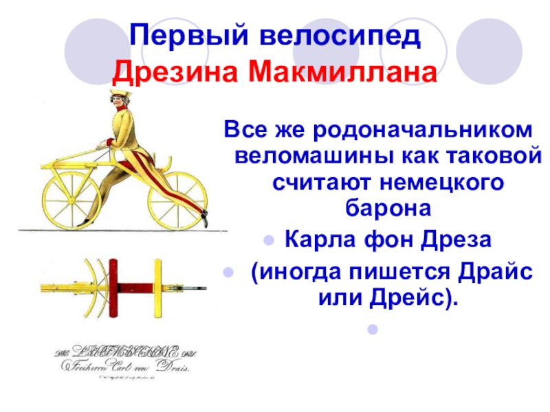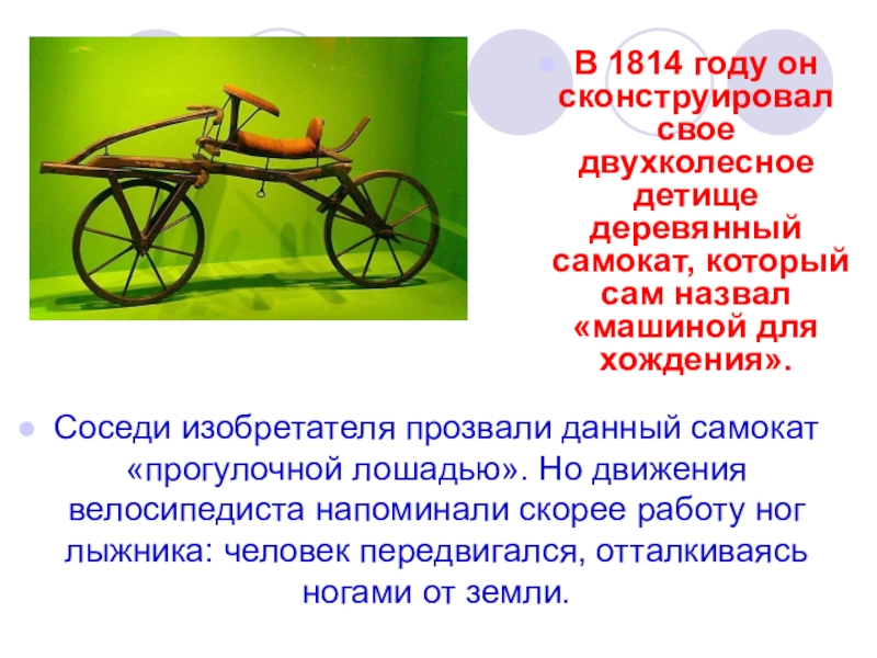 В 1814 году он сконструировал свое двухколесное детище деревянный самокат, который сам назвал «машиной для хождения».