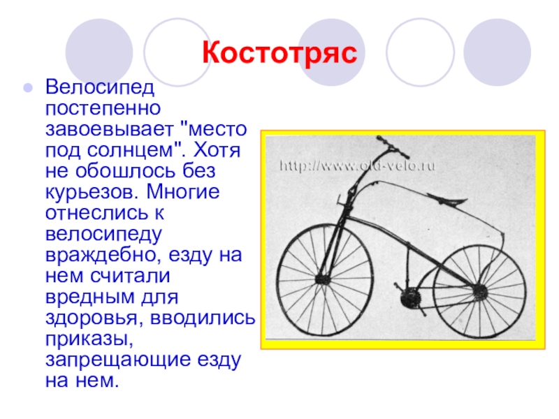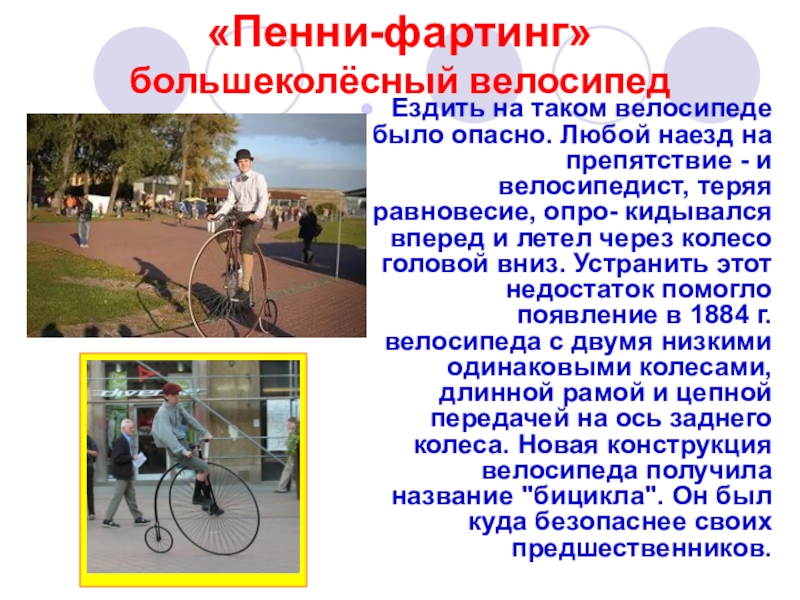 Ездить на таком велосипеде было опасно. Любой наезд на препятствие - и велосипедист, теряя равновесие, опро- кидывался вперед и летел через колесо головой вниз. Устранить этот недостаток помогло появление в 1884 г. велосипеда с двумя низкими одинаковыми колесами, длинной рамой и цепной передачей на ось заднего колеса. Новая конструкция велосипеда получила название "бицикла". Он был куда безопаснее своих предшественников.