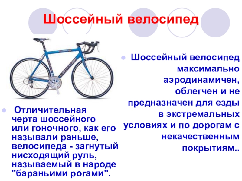Отличительная черта шоссейного или гоночного, как его называли раньше, велосипеда - загнутый нисходящий руль, называемый в народе "бараньими рогами".