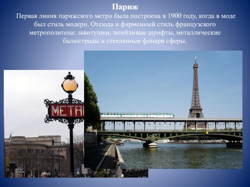 Париж Первая линия парижского метро была построена в 1900 году, когда в моде был стиль модерн. Отсюда