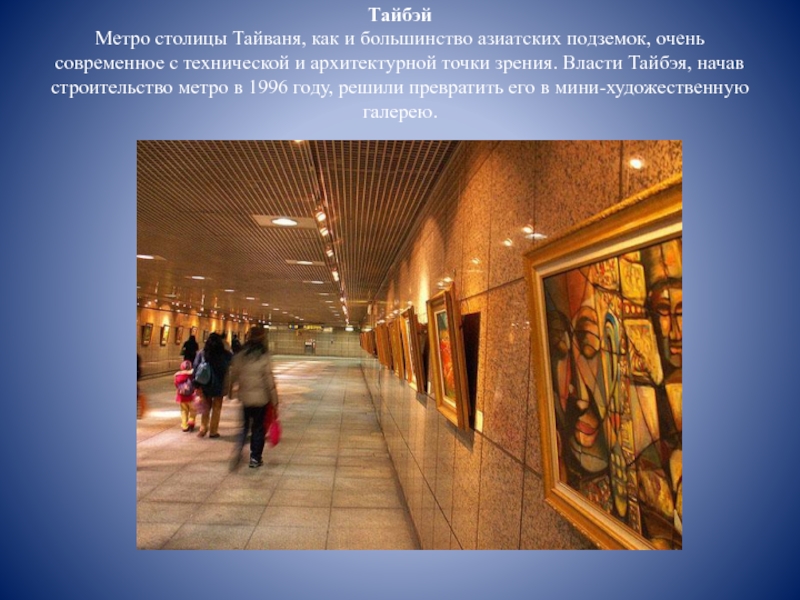 технической и архитектурной точки зрения. Власти Тайбэя, начав строительство метро в 1996 году, решили превратить его в мини-художественную галерею.
