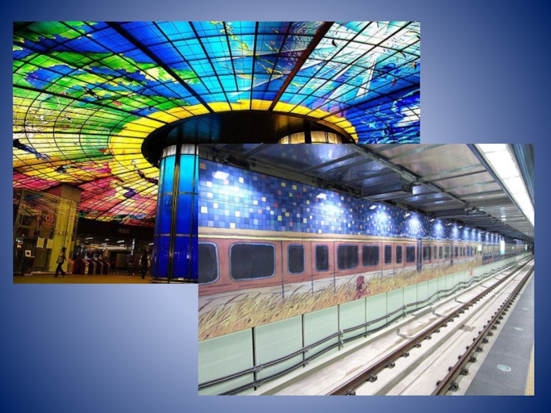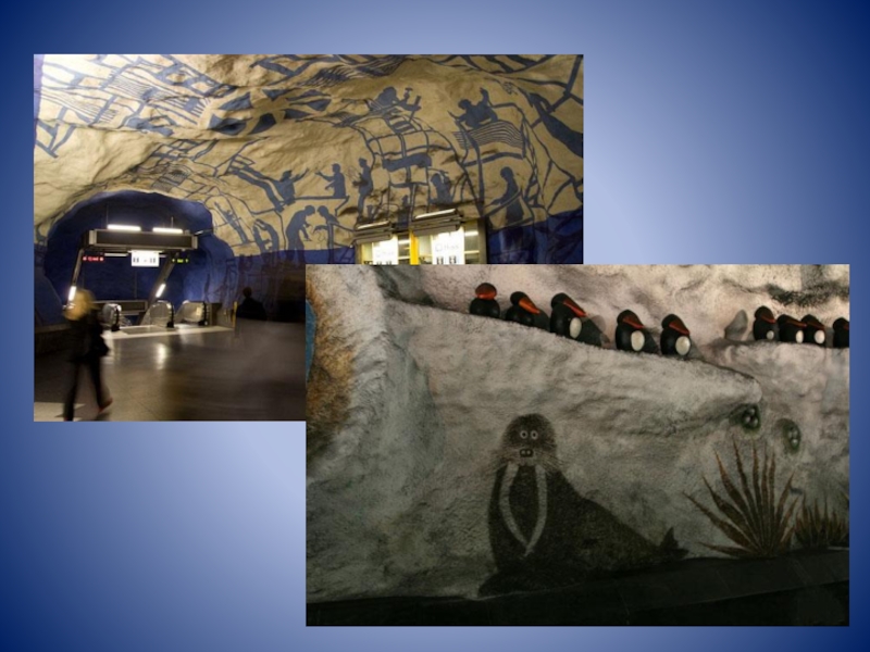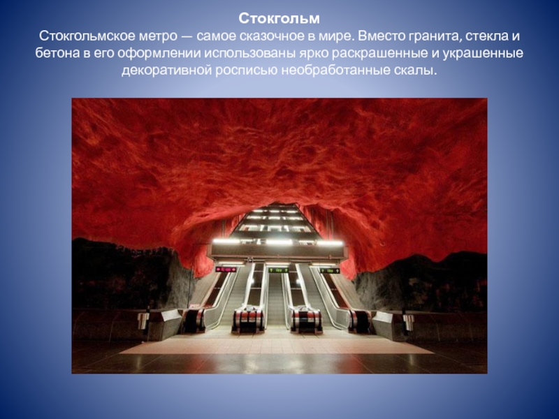 Слайд 9Стокгольм Стокгольмское метро — самое сказочное в мире. Вместо гранита, стекла и