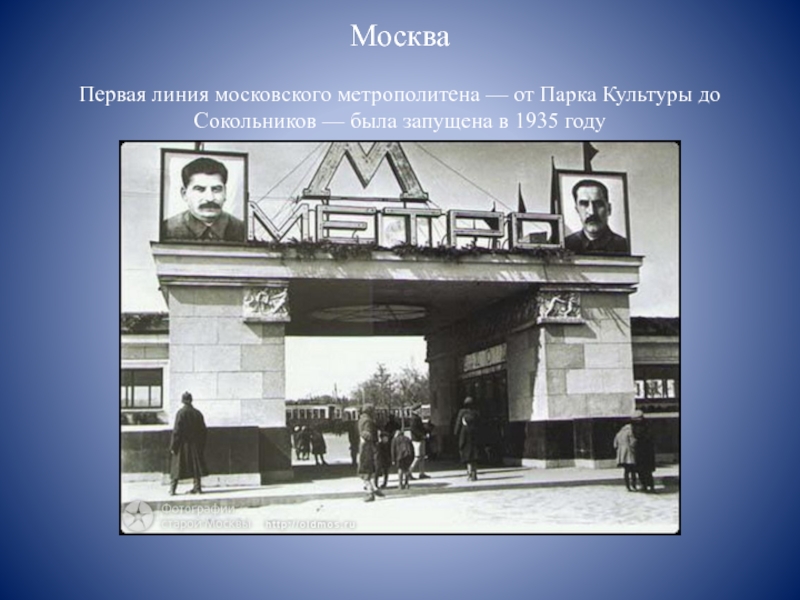 Москва  Первая линия московского метрополитена — от Парка Культуры до Сокольников — была запущена в 1935