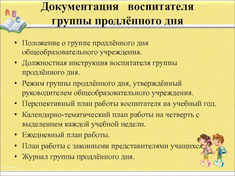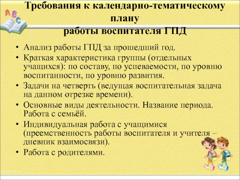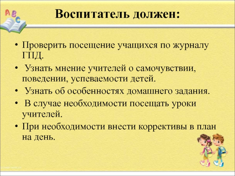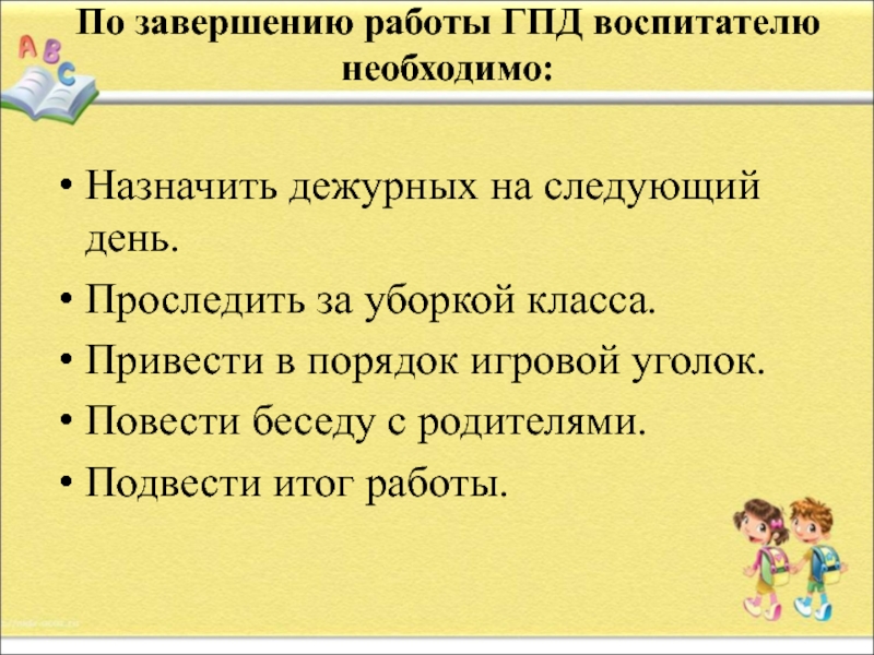 Слайд 12По завершению работы ГПД воспитателю необходимо: