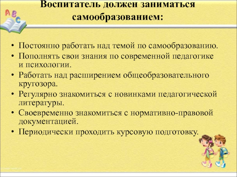 Слайд 16Воспитатель должен заниматься самообразованием: