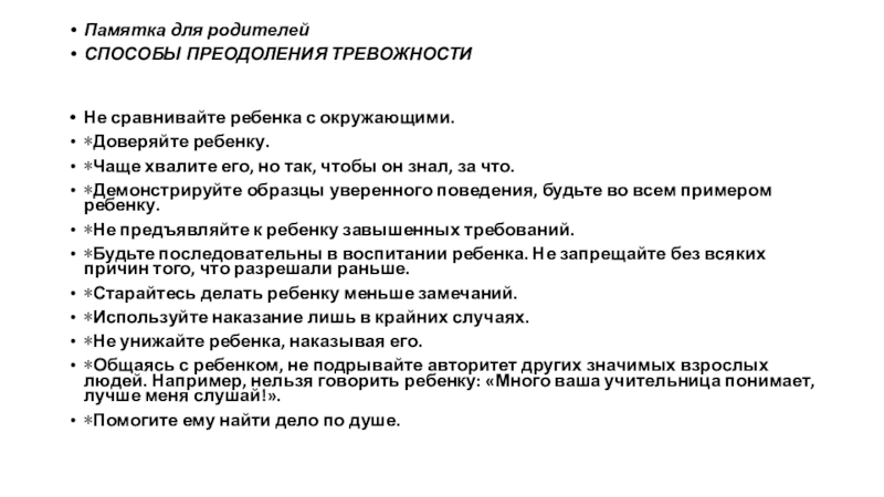 Памятка для родителейСПОСОБЫ ПРЕОДОЛЕНИЯ ТРЕВОЖНОСТИ Не сравнивайте ребенка с окружающими.∗Доверяйте ребенку.∗Чаще хвалите его, но так, чтобы он