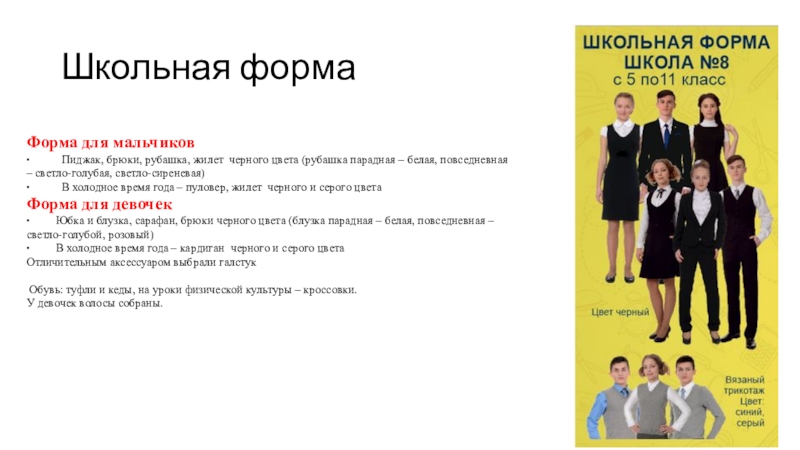 Школьная формаФорма для мальчиков·           Пиджак, брюки, рубашка, жилет  черного цвета (рубашка парадная – белая, повседневная – светло-голубая, светло-сиреневая)·           В