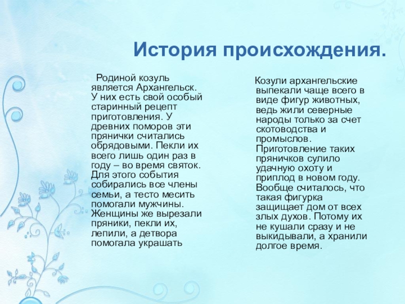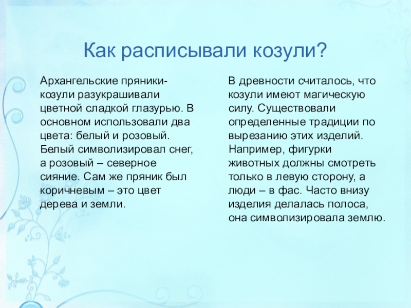 Козули архангельские выпекали чаще всего в виде фигур животных, ведь жили северные народы только за счет скотоводства и промыслов. Приготовление таких пряничков сулило удачную охоту и приплод в новом году. Вообще считалось, что такая фигурка защищает дом от всех злых духов. Потому их не кушали сразу и не выкидывали, а хранили долгое время.
