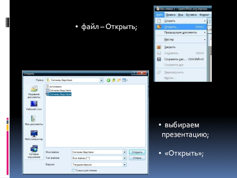 файл – Открыть; выбираем презентацию; «Открыть»;