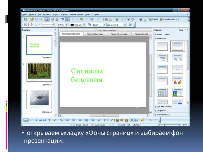 открываем вкладку «Фоны страниц» и выбираем фон презентации.