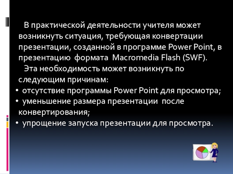 В практической деятельности учителя может возникнуть ситуация, требующая конвертации презентации, созданной в программе Power Point, в презентацию формата Macromedia Flash (SWF). Эта необходимость может возникнуть по следующим причинам: отсутствие программы Power Point для