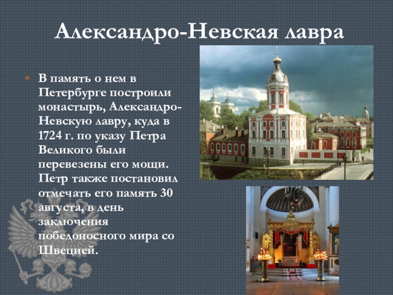 Александро-Невскую лавру, куда в 1724 г. по указу Петра Великого были перевезены его мощи. Петр также постановил отмечать его память 30 августа, в день заключения победоносного мира со Швецией.