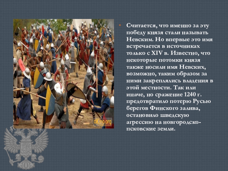 впервые это имя встречается в источниках только с XIV в. Известно, что некоторые потомки князя также носили имя Невских, возможно, таким образом за ними закреплялись владения в этой местности. Так или иначе, но сражение 1240 г. предотвратило потерю Русью берегов Финского залива, остановило шведскую агрессию на новгородско-псковские земли.