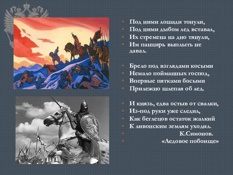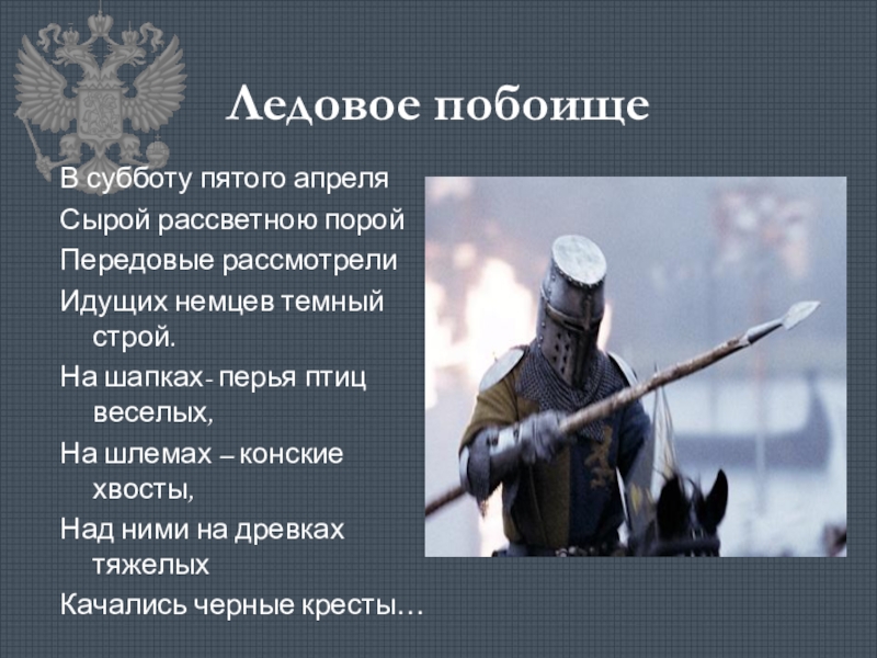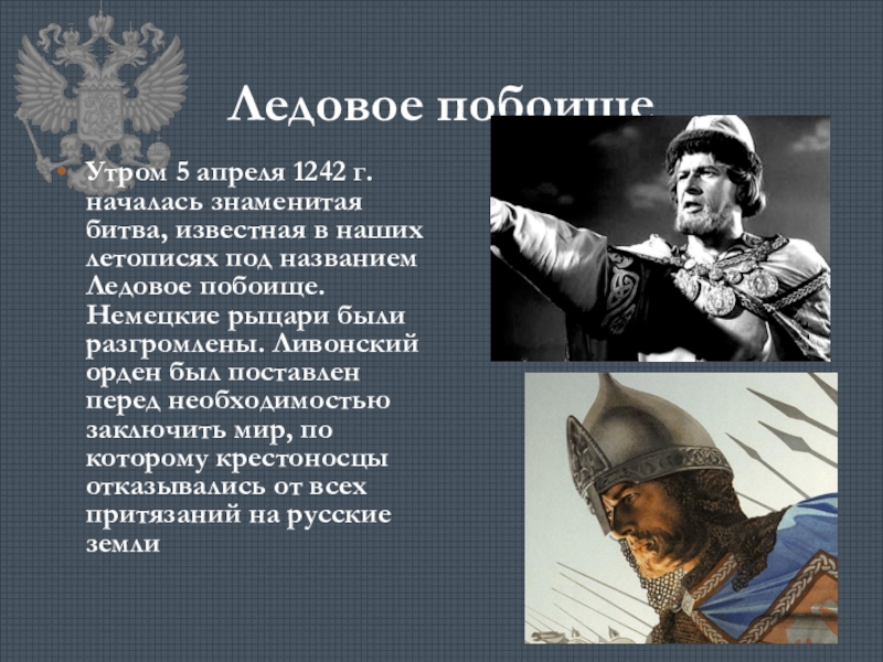 наших летописях под названием Ледовое побоище. Немецкие рыцари были разгромлены. Ливонский орден был поставлен перед необходимостью заключить мир, по которому крестоносцы отказывались от всех притязаний на русские земли