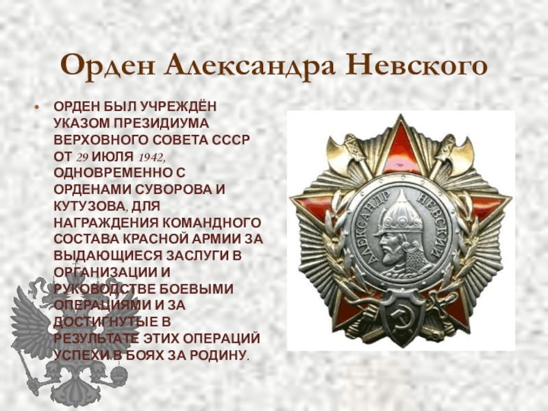 29 ИЮЛЯ 1942, ОДНОВРЕМЕННО С ОРДЕНАМИ СУВОРОВА И КУТУЗОВА, ДЛЯ НАГРАЖДЕНИЯ КОМАНДНОГО СОСТАВА КРАСНОЙ АРМИИ ЗА ВЫДАЮЩИЕСЯ ЗАСЛУГИ В ОРГАНИЗАЦИИ И РУКОВОДСТВЕ БОЕВЫМИ ОПЕРАЦИЯМИ И ЗА ДОСТИГНУТЫЕ В РЕЗУЛЬТАТЕ ЭТИХ ОПЕРАЦИЙ УСПЕХИ В БОЯХ ЗА РОДИНУ.